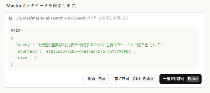 MFAを設定しているユーザーはアクセストークンの設定が必要です。このページの「ユーザーがMashuのサインインにMFAを設定している場合」を確認して設定ください。 - チャットAIがメタデータをMashuで検索しない