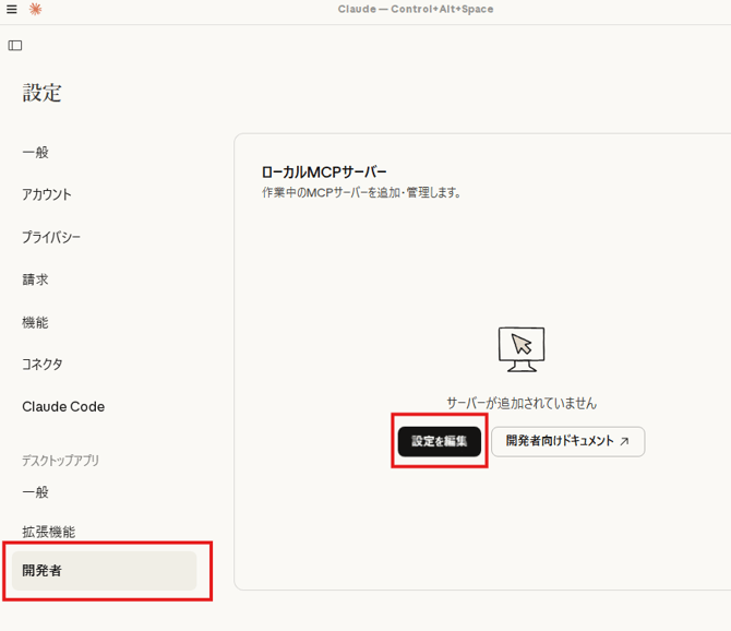2. Claude Desktopを起動して「設定」メニューを選択します。