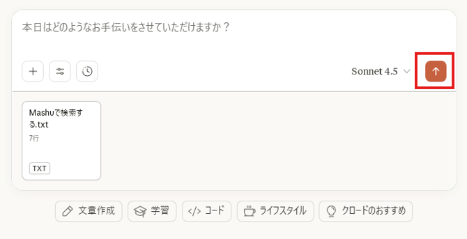 テキストファイルが添付されるのでそのままチャット送信ボタンをクリックするとAIがMashuで検索を開始します。