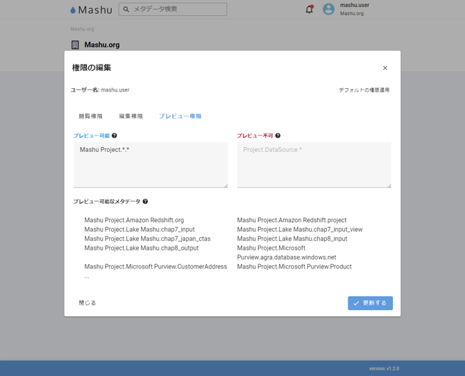 Mashuのデータ構造は、組織の下にプロジェクトがあり、プロジェクトの下にメタデータソースがあります。メタデータソースは、データを管理するシステムの単位に作ります。