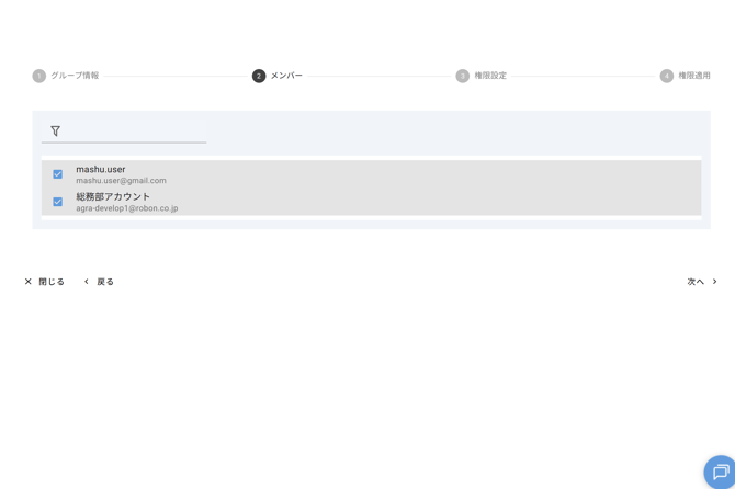 グループに含めるメンバーを指定します。ここで選択したメンバーに対して一括で権限が適用できるようになります。