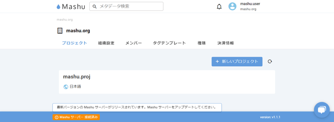 クラウド上のMashuがバージョンアップして、接続しているMashuサーバーのバージョンが古くなってしまった場合は、Mashuにサインインした際に、次のように警告が表示されます。
