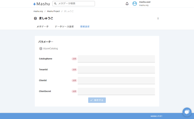 Azure Data Catalog との連携には、Azureの認証情報が必要です。Mashuでは、Azure AD のアプリによる連携を行います。この認証には、Azure AD のテナントID、接続するアプリのアプリケーション(クライアント)ID、接続するアプリ用に生成したクライアントシークレットが必要となります。また、連携するData Catalogの名前も必要です。