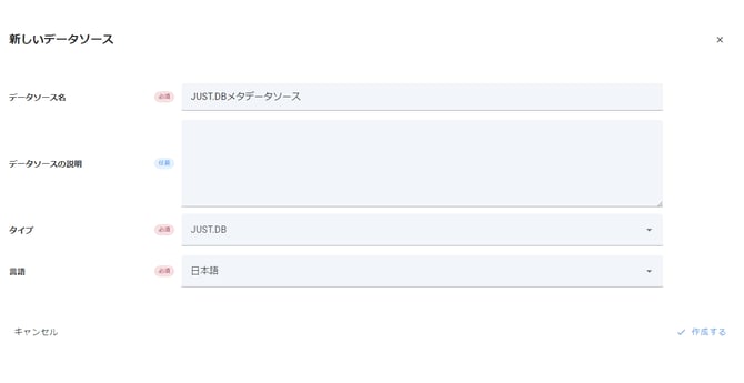 1. タイプとしてJUST.DBを選択し、メタデータソースを作成します。
