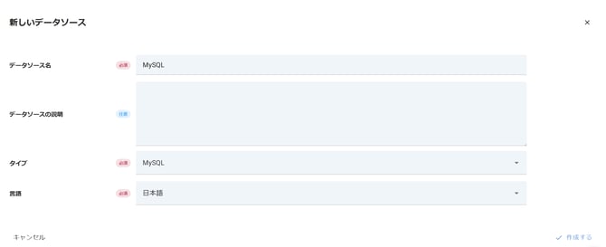 MySQLのメタデータを同期するために、タイプとして「MySQL」を選択してデータソースを作成します。