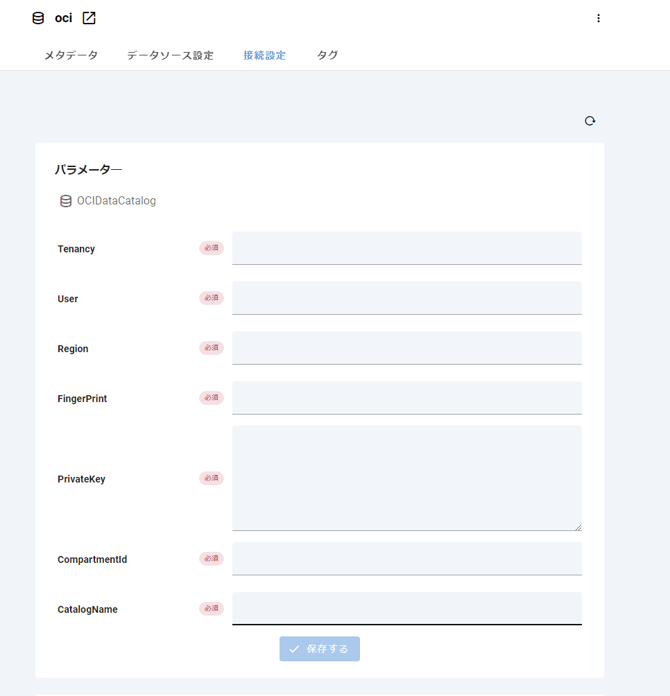 Olacle Cloud Infrastructure の Data Catalog に対するメタデータソースを作成するためには、メタデータソースを作成する際にタイプとして OCICatalogを選択する必要があります。