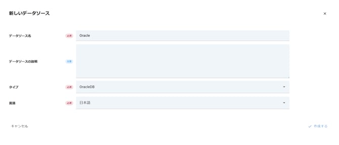 Oracleのメタデータを同期するために、タイプとして「OracleDB」を選択してデータソースを作成します。