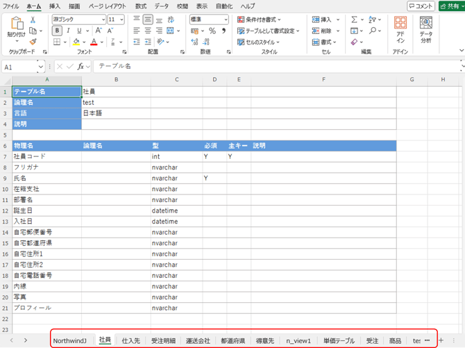 テーブルごとにシートを分けて情報を出力します。