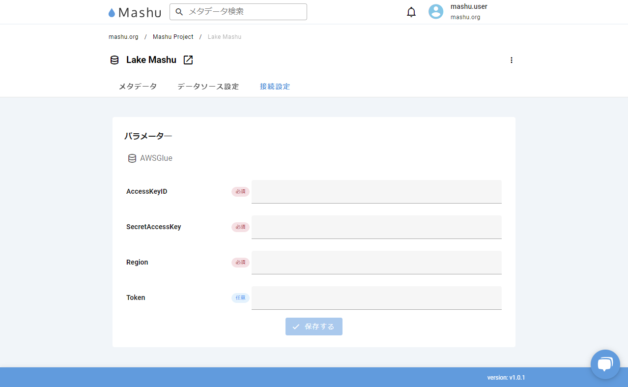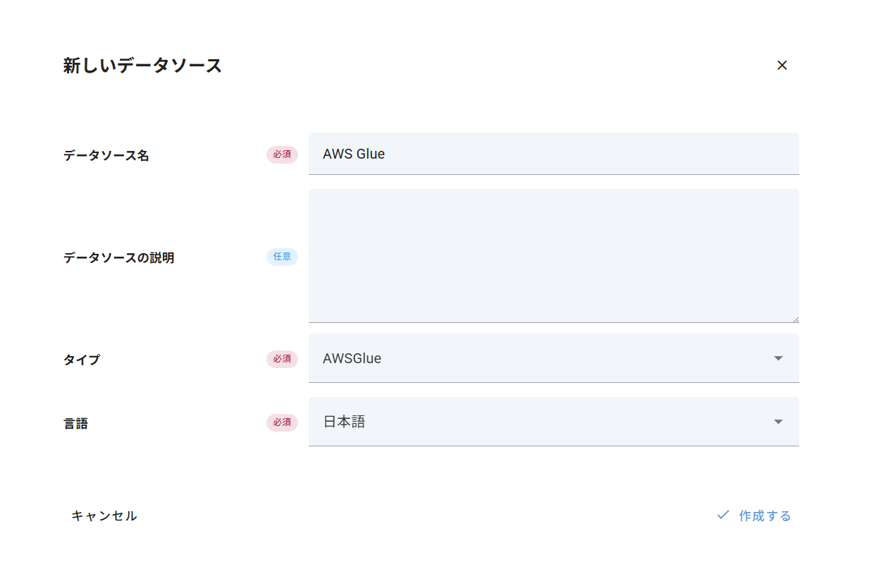 1. メタデータソースの作成 Mashuにログインし、データソース作成画面を開きます。 データソースのタイプとして 「AWSGlue」 を選択して、新しいデータソースを作成します。 2. AWS IA...
