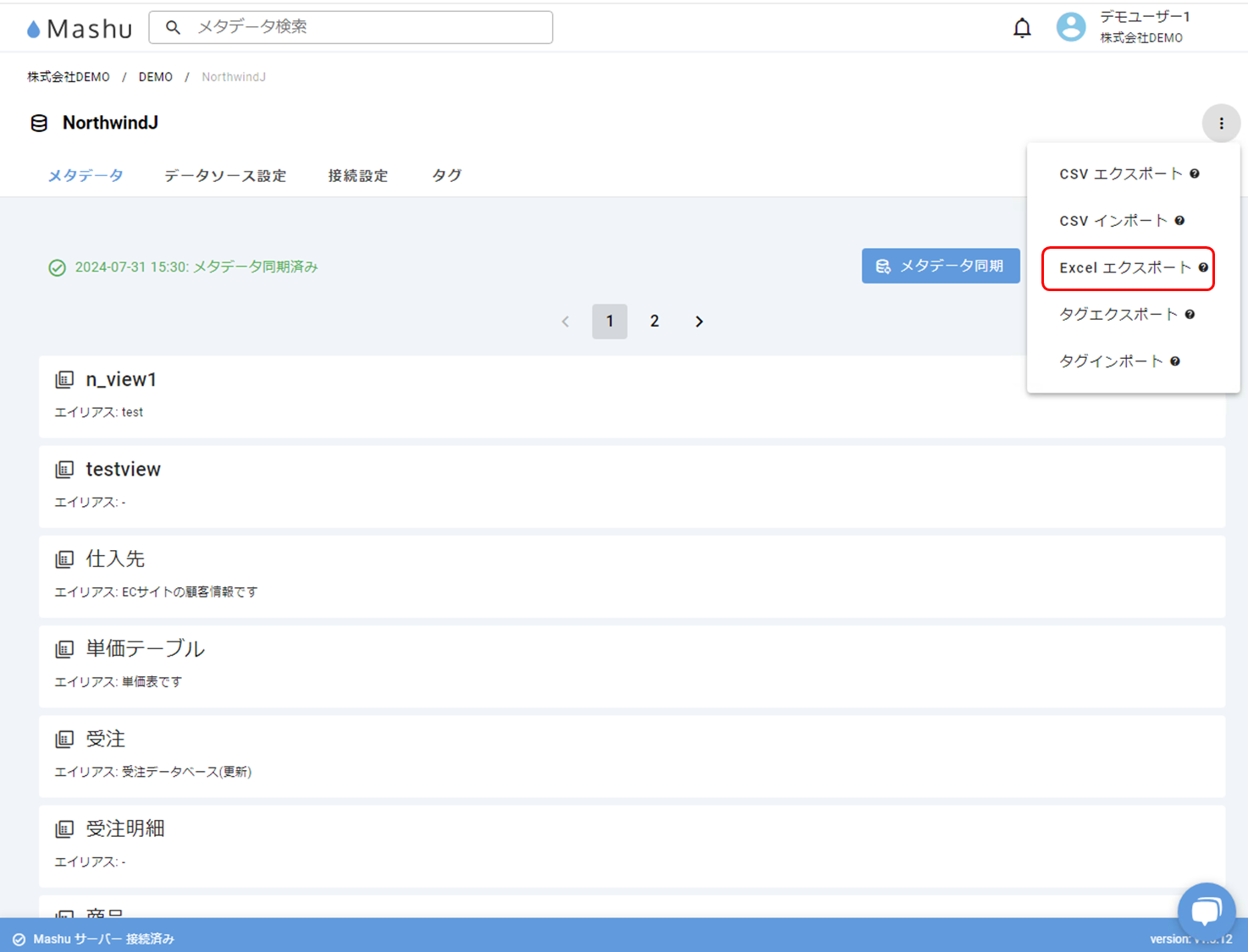 Mashuのデータ構造は、組織の下にプロジェクトがあり、プロジェクトの下にメタデータソースがあります。Mashuが管理するメータデータは、メタデータソースから抽出したものです。このタブでは、そのメタデ...