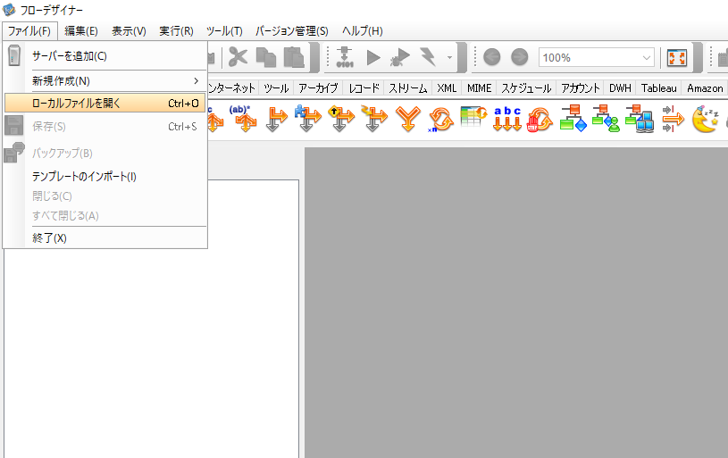 ASTERIA Warpサーバーからプロジェクトのxfpファイルを取得する ASTERIA Warpのフローデザイナーを起動して、「ファイル」ボタンを押下し、「ローカルファイルを開く」ボタンを押下しま...