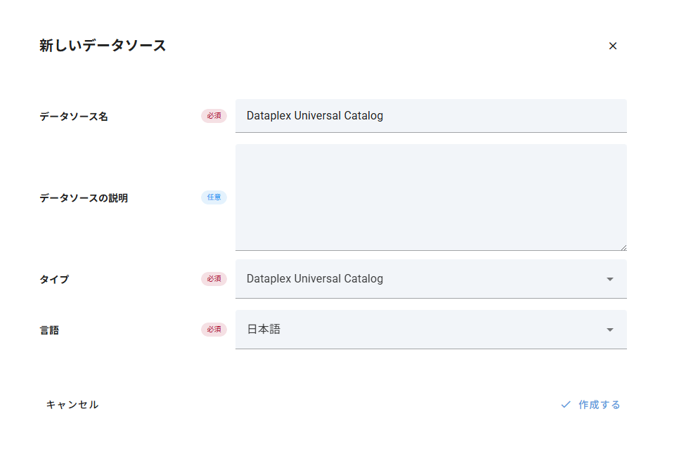 1. データソースの作成 Mashuに新しいデータソースを作成します。データソースのタイプ選択画面で、「Dataplex Universal Catalog」を選択してください。