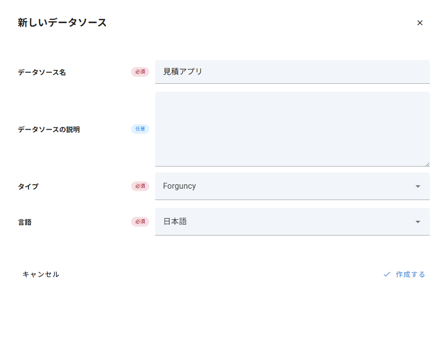 1. データソースの作成 Mashuに新しいデータソースを作成します。データソースのタイプ選択画面で、「Forguncy」を選択してください。