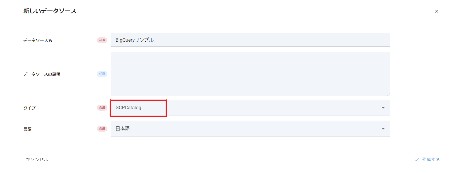 GCP BigQueryに対するメタデータソースを作成するためには、タイプにGCP Catalogを選択してメタデータソースを作成します。
