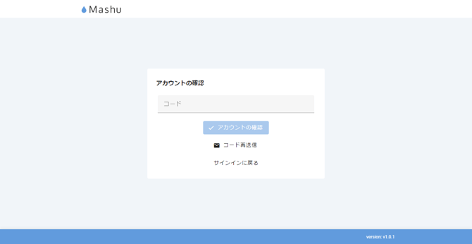 アカウントの確認画面では、「Mashu確認コード」メールで送られた確認コードを入力して、「アカウントの確認」ボタンを押してください。