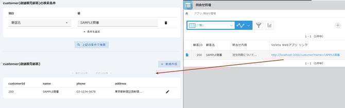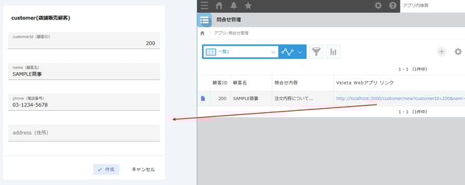 - アプリ更新後、問合せ管理アプリにデータを登録すると、Veleta Webアプリへのリンクが表示できます。これで問合せ管理アプリから顧客のデータを閲覧できるようになりました。